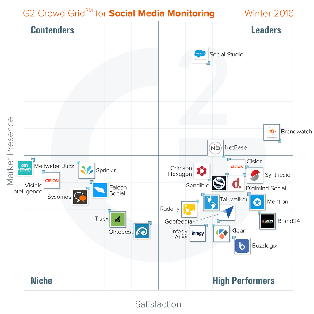 Daneben bietet  G2 Crowd mit ihrem Social Media Monitoring Grid ebenfalls eine spannende Übersicht.